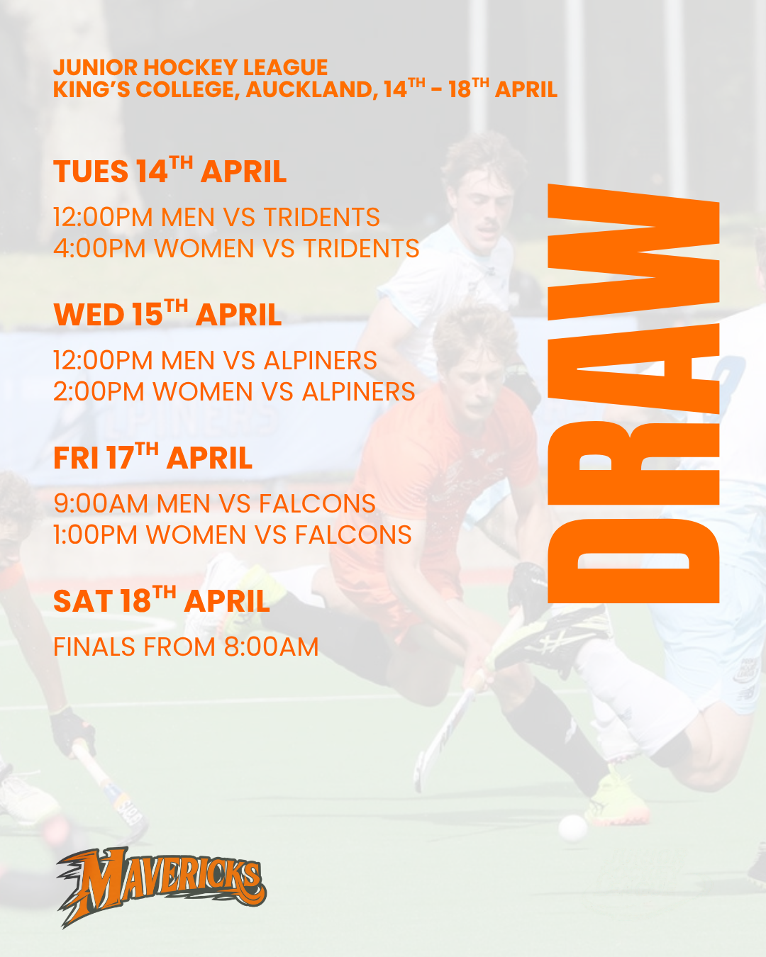The Junior Hockey league is coming up! With our best U21 players taking on the Tridents, Alpiners and Falcons from the 14th of April at Kings College, Auckland!